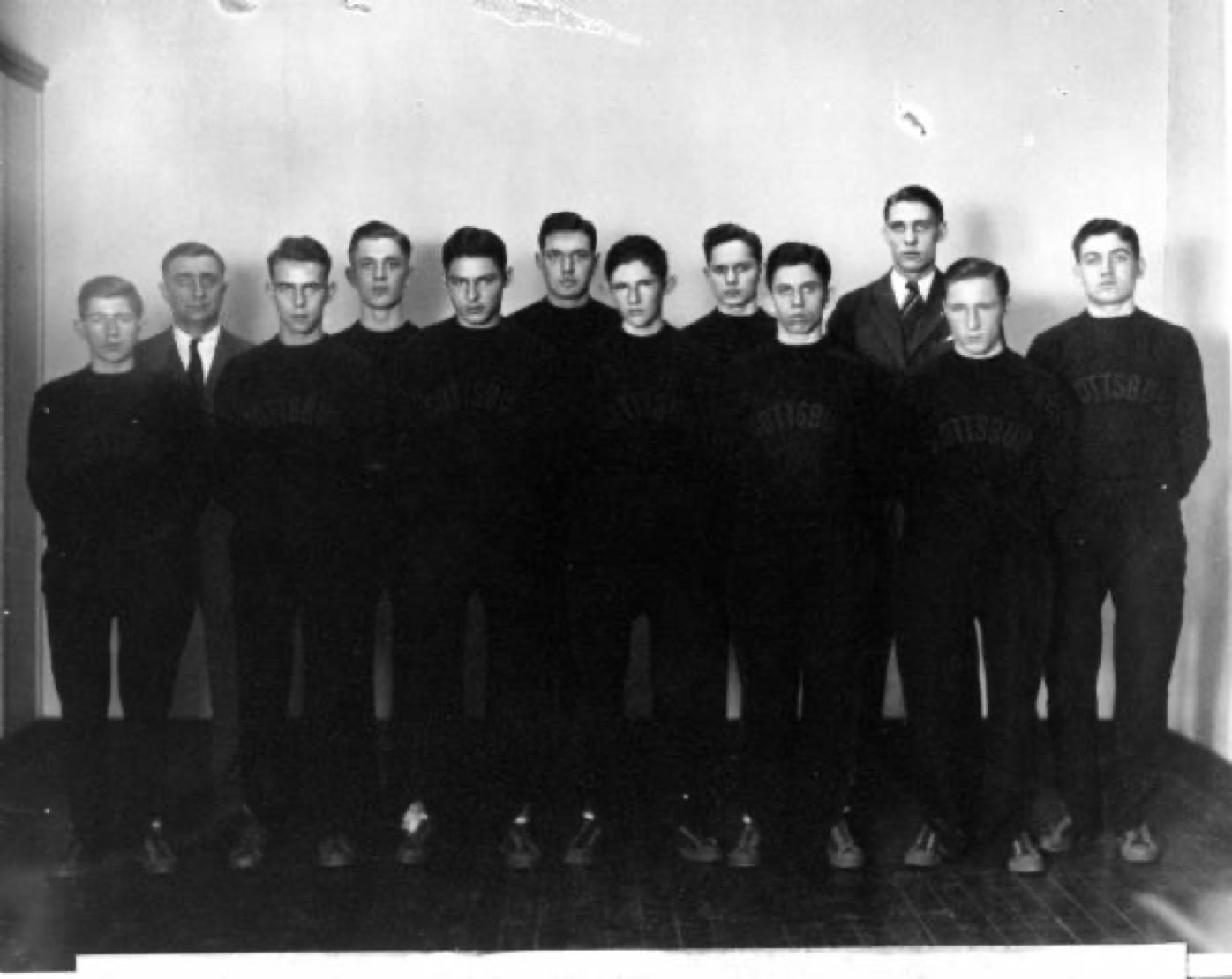 (L to R) Wilbur Moody, J. A. Mohler (Principal), Lowry Humphrey, Claude Crum, Hubert Shields, Pat Miller, Hugh Murphy, Leland Hughbanks, Morris Carter, Ike Lyons (Coach), Dallas Watterson, Woody Weir