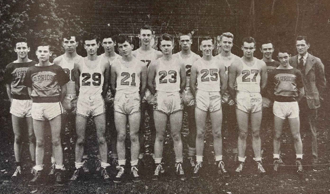 Top Row: (L to R) John Smith, George Hahn, Bill Everitt, Bill Ritter, Vaughn Lawson, Bill Wolff, Lloyd Everitt, Coach Ralph Feeler