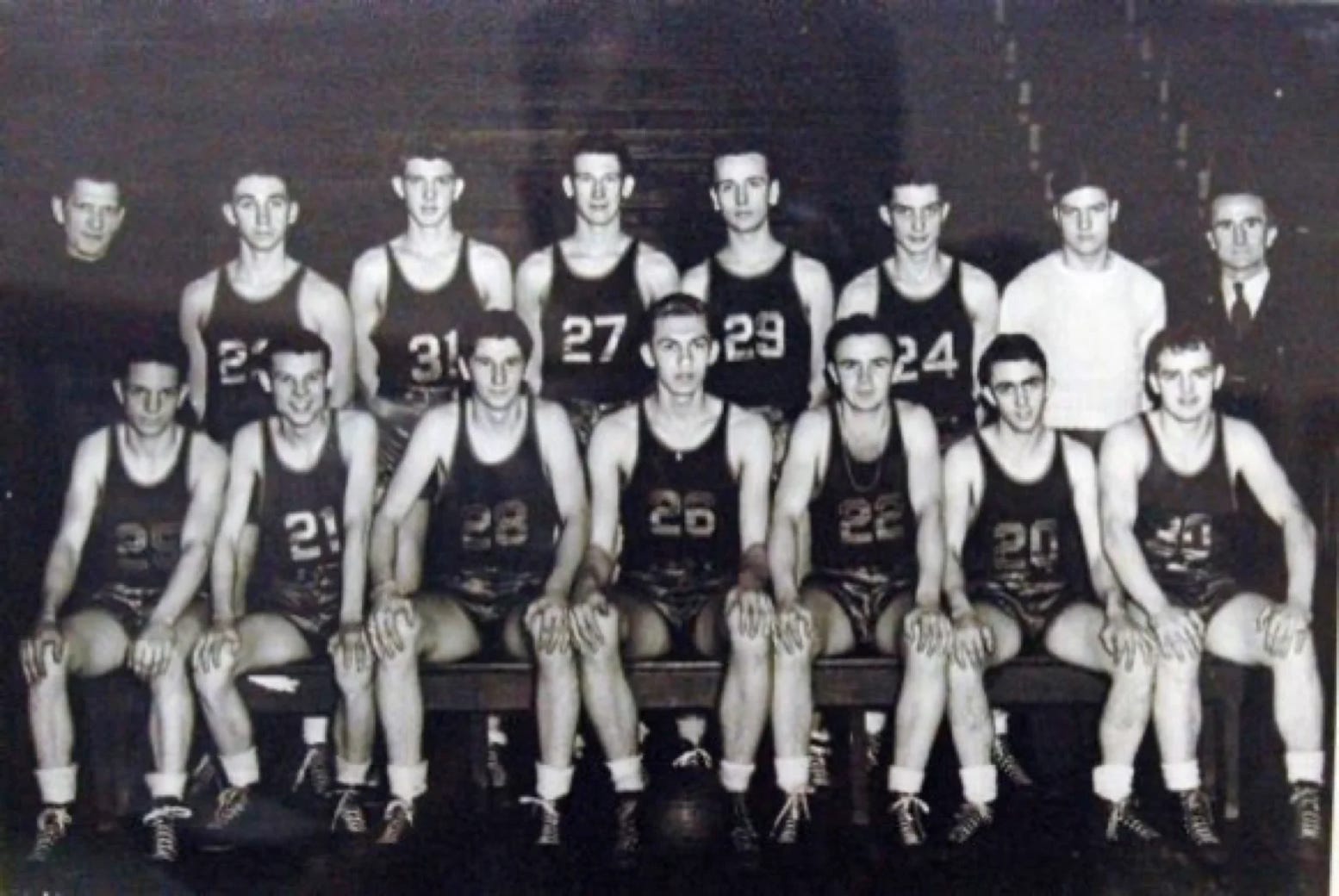 Standing (L to R) Ralph Feeler (Coach), Robert Dean, Kenneth Thompson, Bob Tash, Bobby Brodt, Bob Spoonmore, Jimmy Dismore (Student Mgr), Cecil Collins (Assistant Coach)