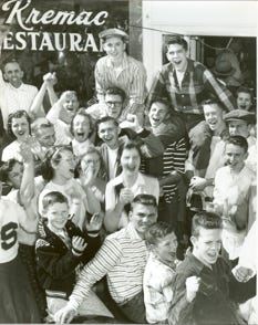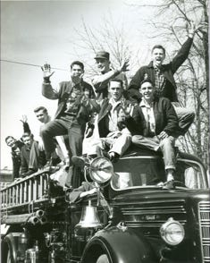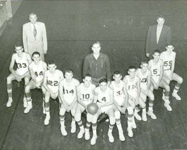 Back Row (L to R) Principal W. H. Spradley, Sherrill Miller, Lynn Hayes, LaVern Altemeyer, Phil Stewart, Gregory Bonsett, Coach Charley Meyer