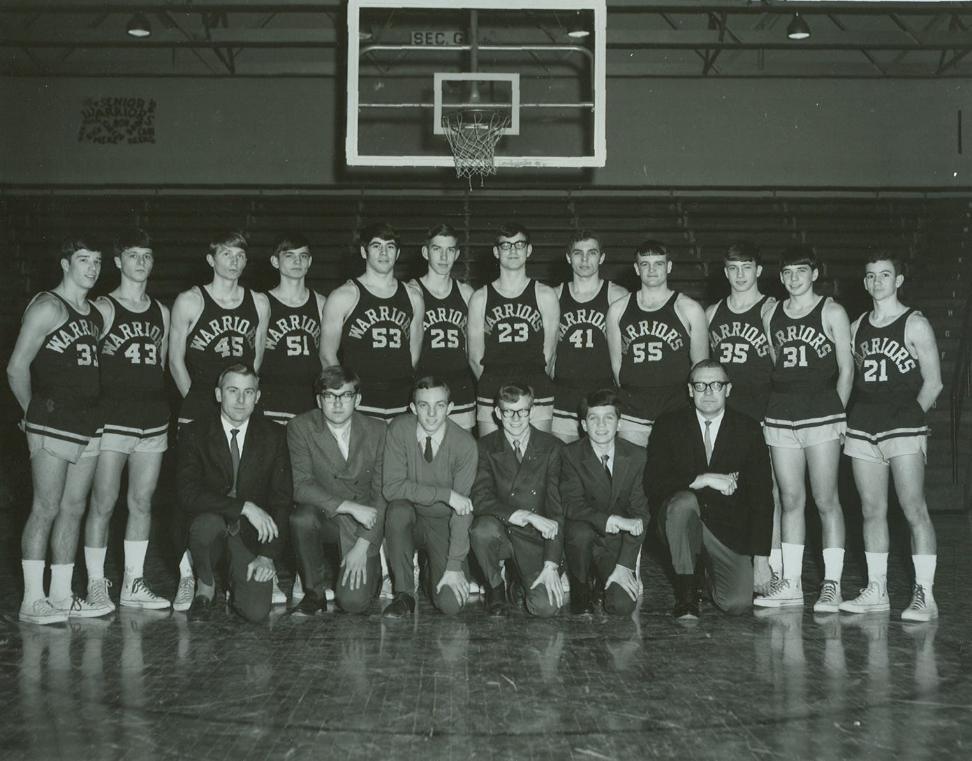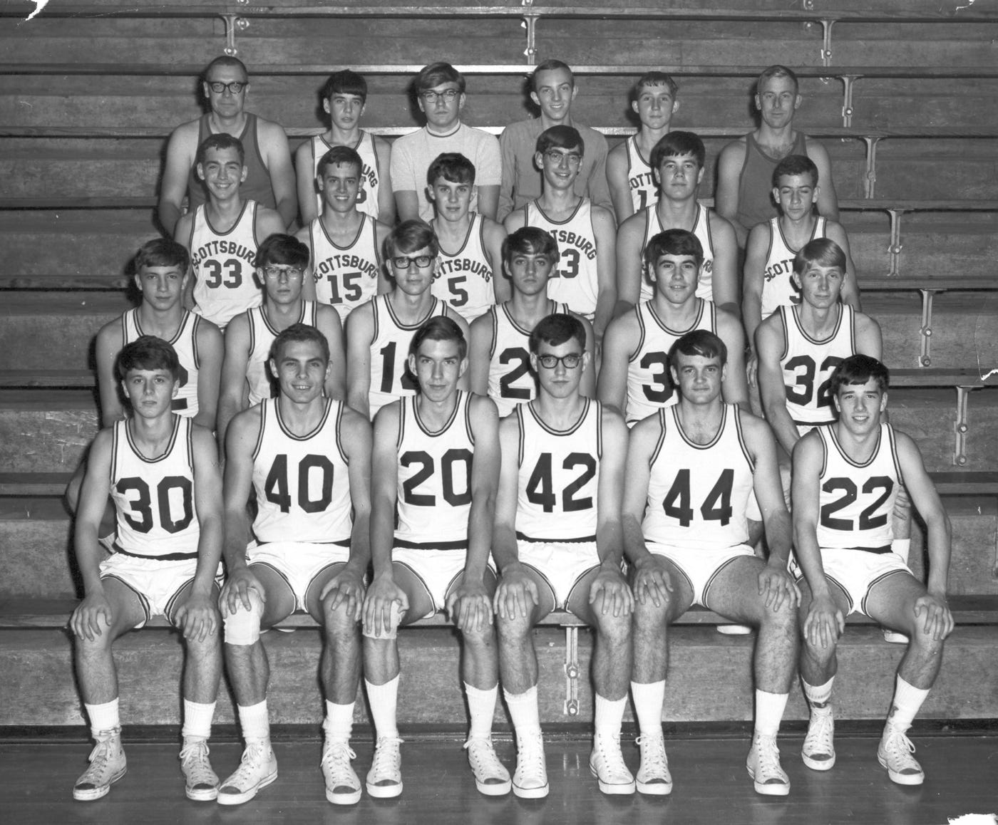 Kneeling (L to R) Assistant Coach Tom Dietrich, Frank Comer, Rodney Burch, Darrell Scifres, Monty Craig, Head Coach Jim Barley