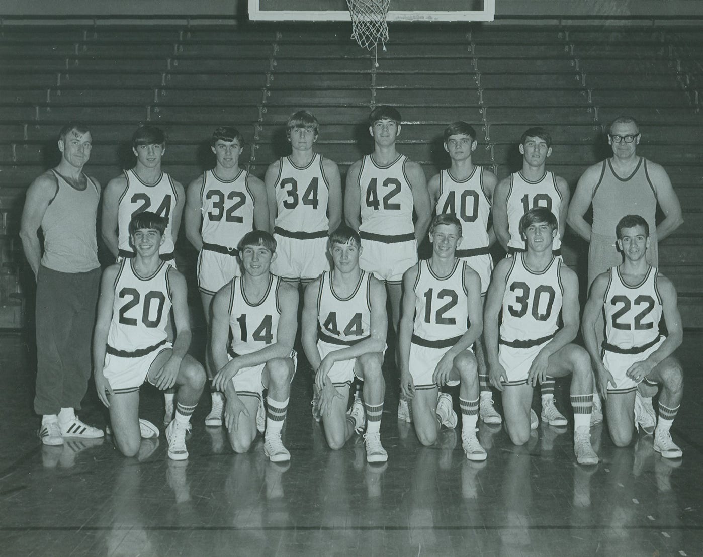 Standing (L-R): Tom Dietrich (Assistant Coach), Kenny Rose, Ron Robertson, Vince Bruce, Tony Lord, Dennis Paden, Charles Hutchinson, Jim Barley (Coach)
