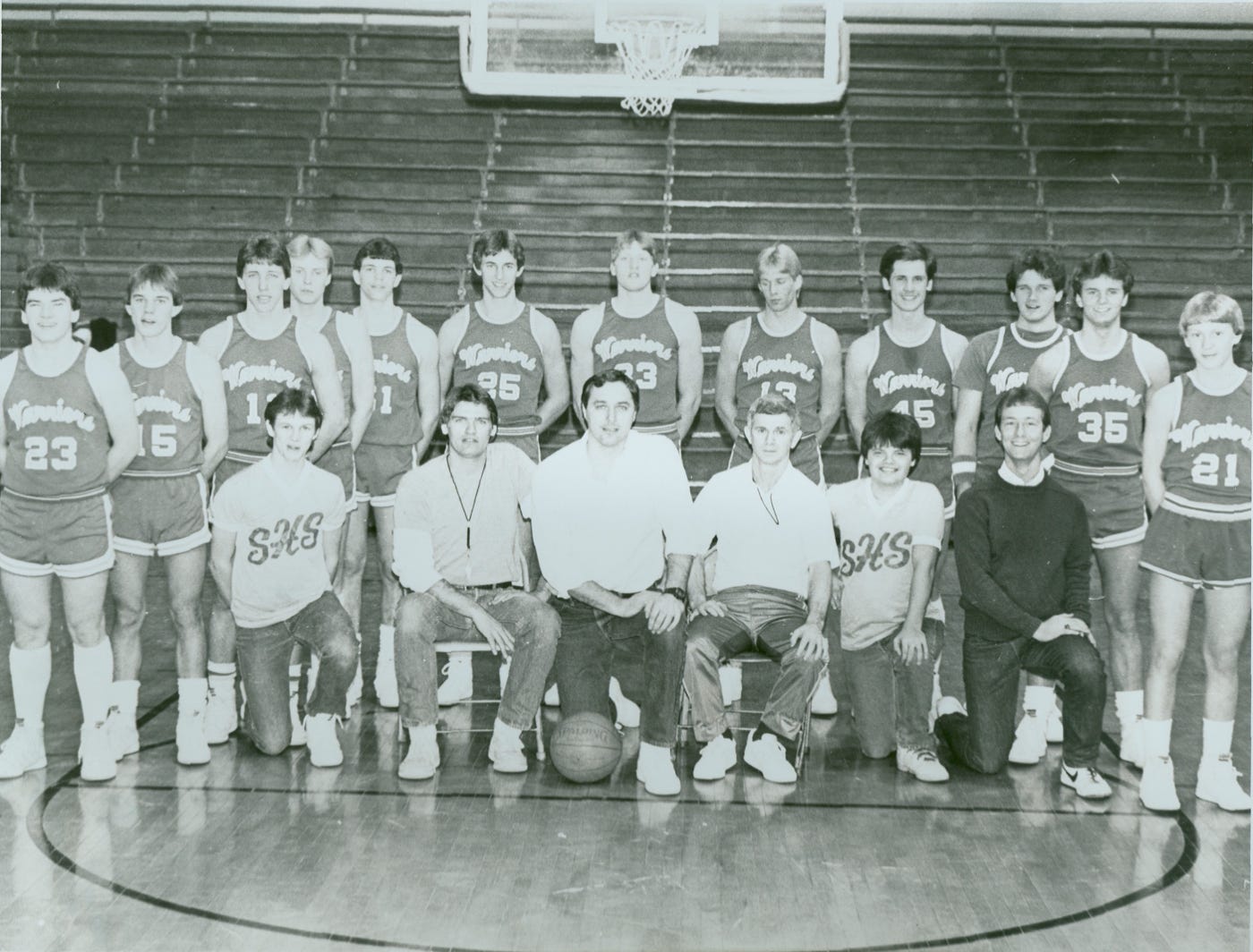 1st Row (L to R) Mgr. Archie Campbell, Asst. Coach Tim Hutchinson, Coach Bill James, Asst. Coach Silas Hall, Mgr. Dale Ziemba, Mgr. Bill Preble