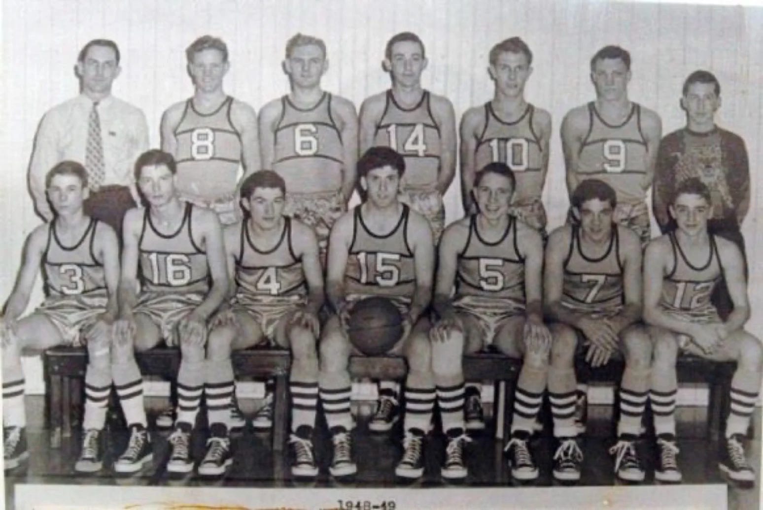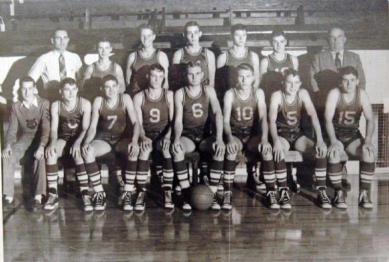 Seated (L to R) Burton Bridgewater (Student Mgr), Tommy Hopwood, Don Hayes, Morris Rose, Russell Smith, Ronald Murphy, Darrell Criswell, Eddie Bridgewater