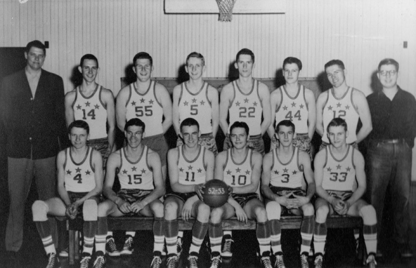 Standing (L to R) Charley Meyer (Coach), Sam Gross, Jim Swinford, Sherman Franz, Hubbard Hougland, Phil Stewart, Larry Amick, Ivan Kallembach (Student Manager)
