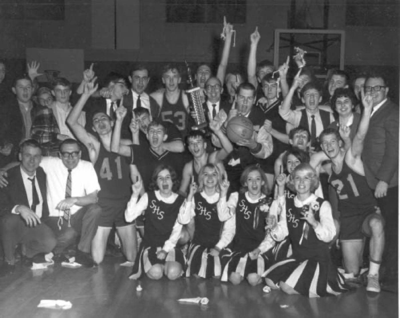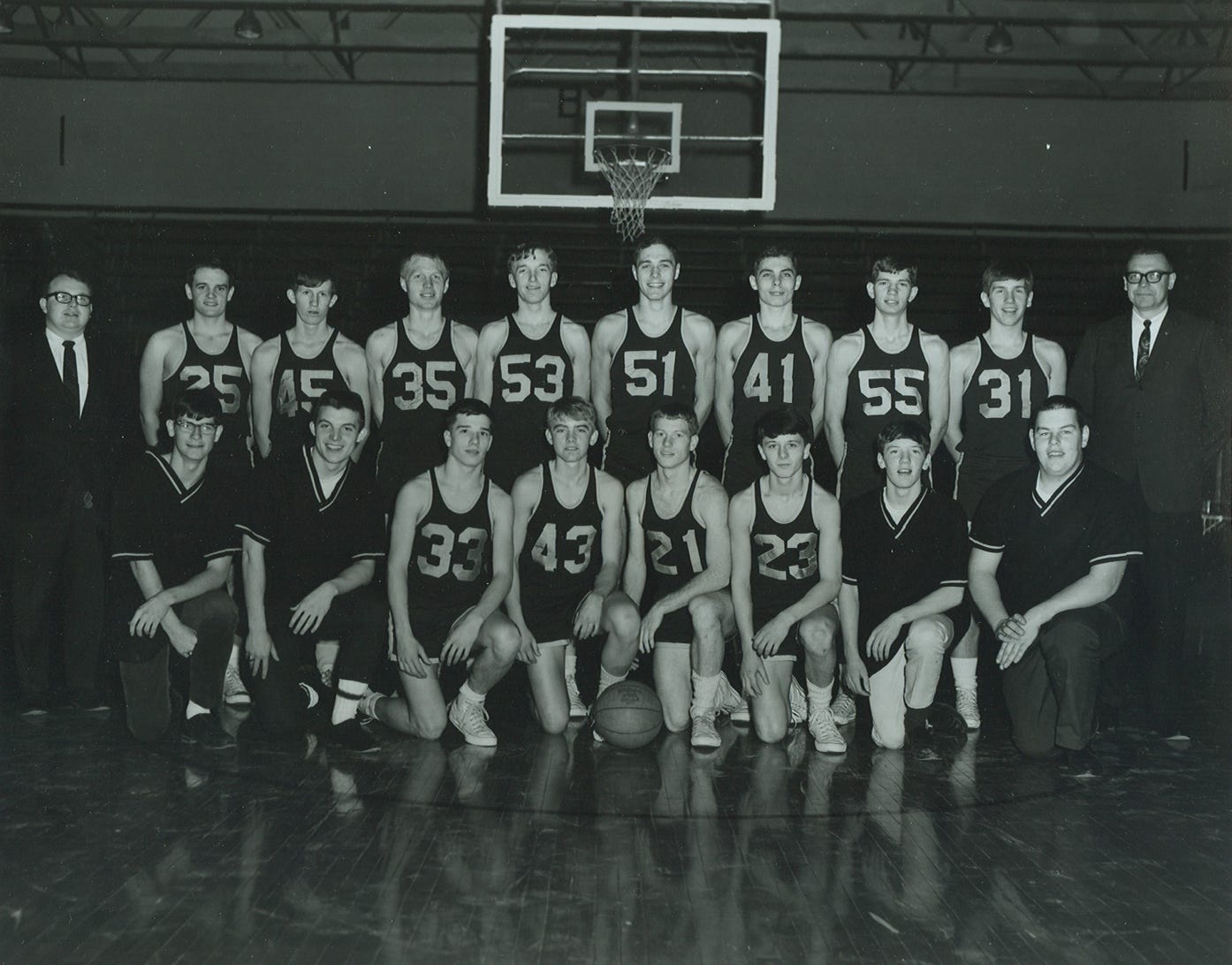 Standing (L-R): Robert Popp (Assistant Coach), Ted Murphy, Kenny Amick, Bill Williams, Dennis Nicholson, Bill James, Bob James, Jerry Lizenby, Greg Hoard, Jim Barley (Coach)