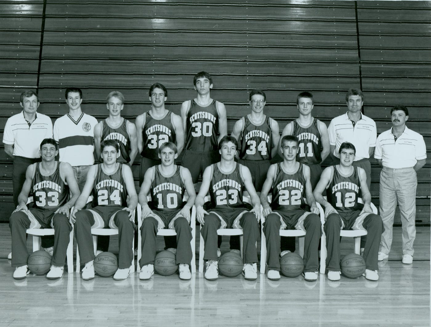 Standing (L-R): Randy Snodgrass (Coach), Aaron Lewis (Student Manager), Chad Marley, Travis Mays, John Ashley, Steve Schafer, Billy Hart, Todd Howard (Assistant Coach), Randy Edwards (JV Coach)