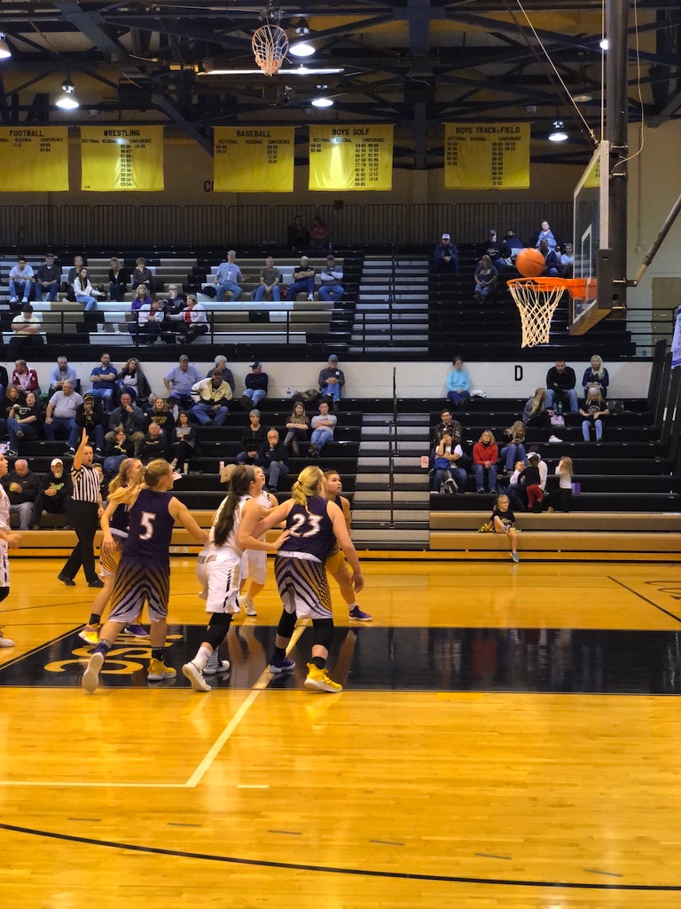 Warriorettes Zoe Zellers with the offensive rebound and putback for 2 of her 14 points in the 71-29 victory over Shawe.